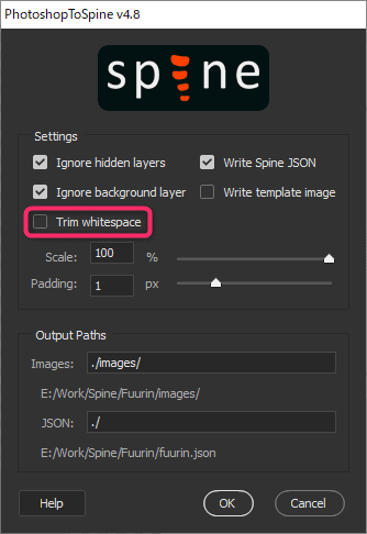 Trim whitespace(余白の削除)のチェックだけ外してOKボタンを押しましょう!PSDデータのあった場所にデータが書き出されます。