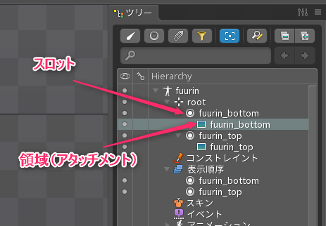 すると選択したアタッチメント+スロットの親階層にアタッチメントと同じ名前で骨が追加されます。