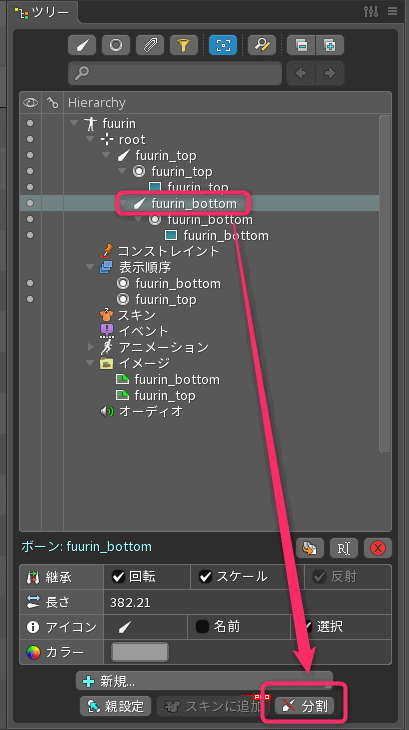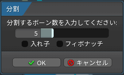 2つめに作成した骨を選択してツリーパネルしたの「分割」ボタンを押します。