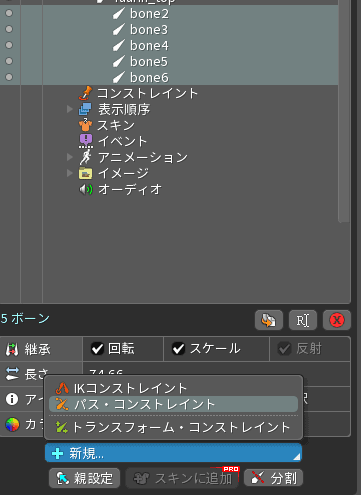 まずは分割した5つの骨だけを選択して、ツリーパネル>新規>「パスコンストレイン」を選択します。