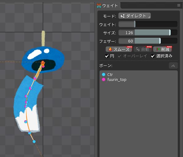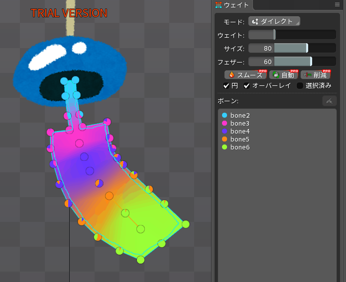 ウェイトパネルの「オーバーレイにチェック」を入れて「自動」を押すと自動でウェイトが割り当てされます。