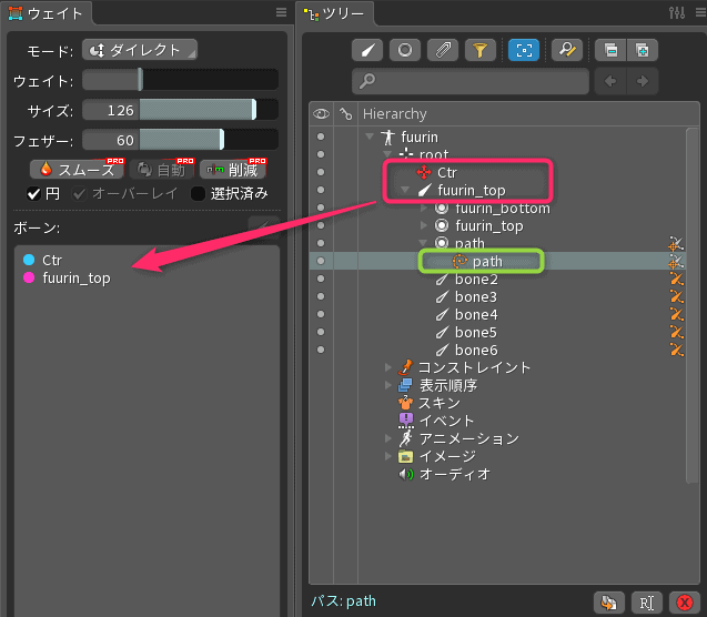 先と同じ手順でパスを選択して、一番上の骨とコントローラーの骨をバインドします。