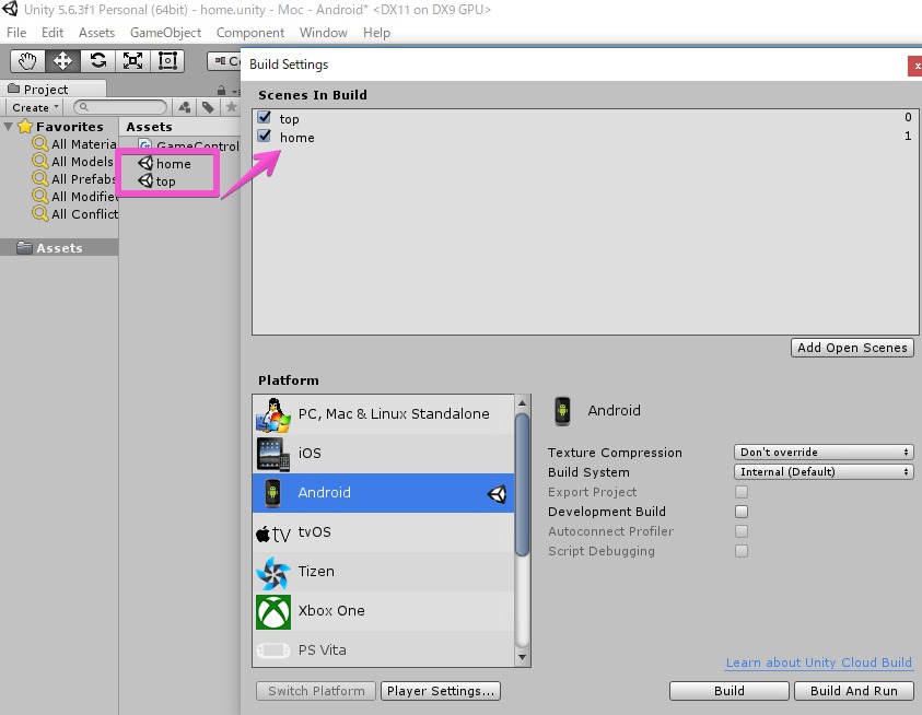 File → Build Settingsを開き、作成した2つのシーンをドラッグ&ドロップで登録します。