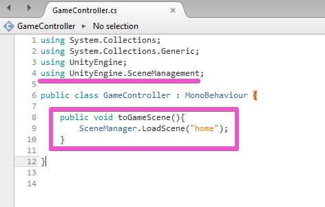 }using UnityEngine.SceneManagement;を追加することで、SceneManagerクラスが使えるようになります。