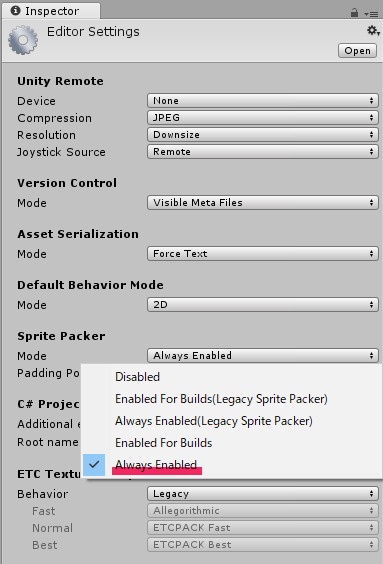 - Sprite Packer ModeをAlways Enabled(常に有効)に設定