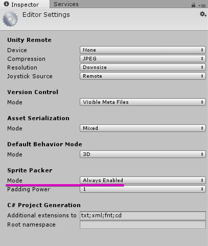 - Sprite Packer ModeをAlways EnabledまたはEnabled for Buildsに設定