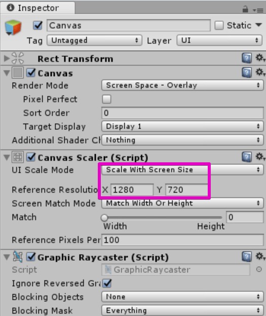 | Scale With Screen Size | 基準解像度を設定してスケーリング(複数端末対応向け) |
