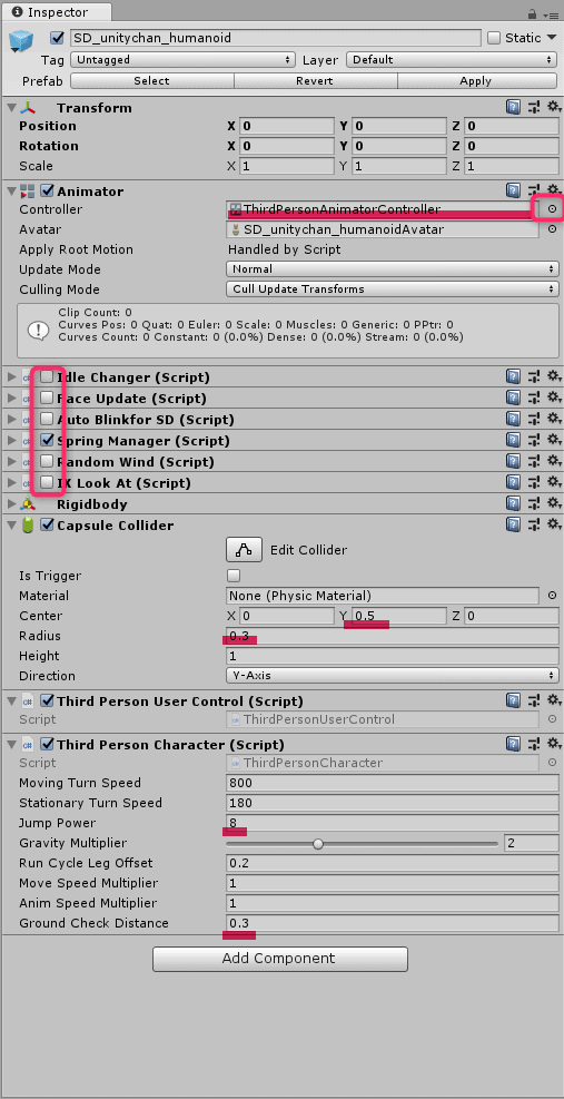 SD_unitychan_humanoidを選択して、右側のInspectorの設定を変更していきます。