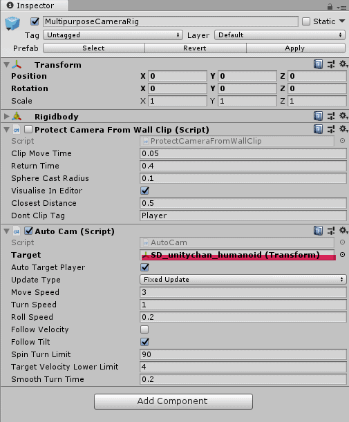 最後にMultipurposeCameraRigを選択してInspectorのAuto CamのTargetをSD_unitychan_humanoidにすれば、カメラがつねにそのキャラクターに追従します。