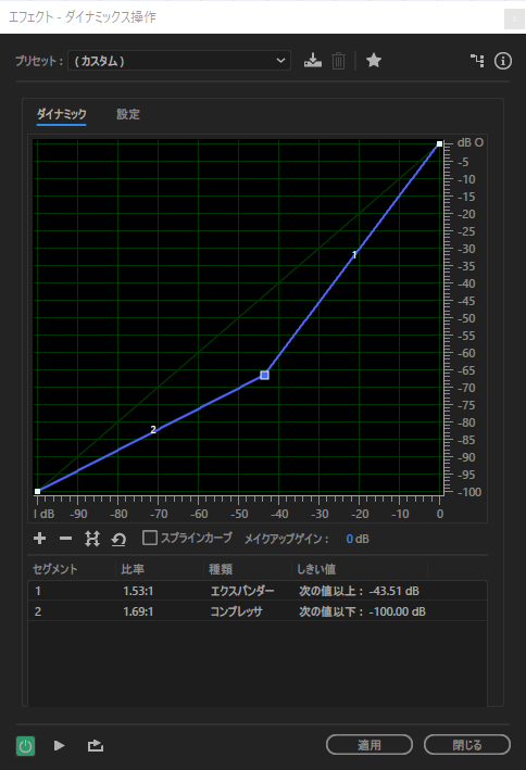 - エフェクト>振幅と圧縮>ダイナミックス操作>カーブを下げ目に