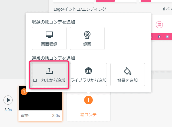 下の「絵コンテ」と書かれた項目のプラスボタンを押して「ローカルから追加」を押して、追加したい動画を選択しましょう。