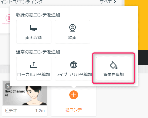 再び「絵コンテ」と書かれた項目のプラスボタンを押して「背景を追加」を選択しましょう。