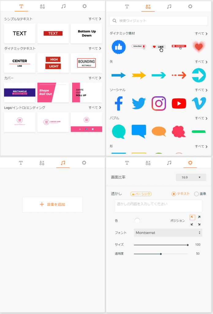 - 素材はテンプレート化されていて、素材から高クオリティの動画を加工編集することも可能