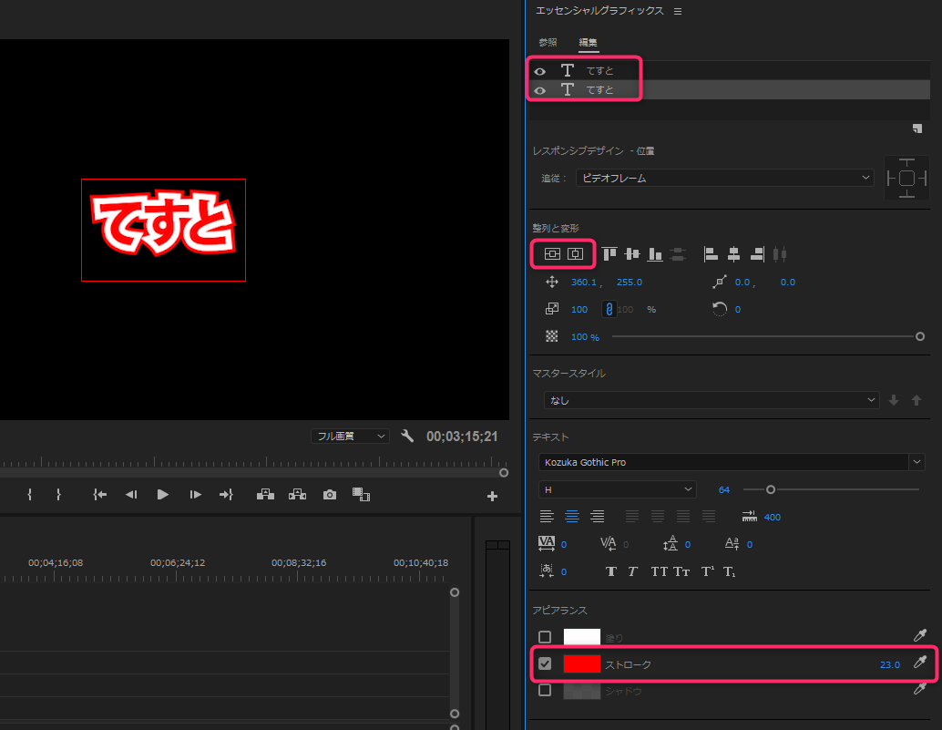 まずはPremiereで通常のテロップ、「2重の縁付きの文字」を作成してみます。