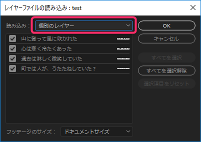 「個別のレイヤー」で読み込みます。フォルダの中に各テロップがレイヤー別で読み込まれます。