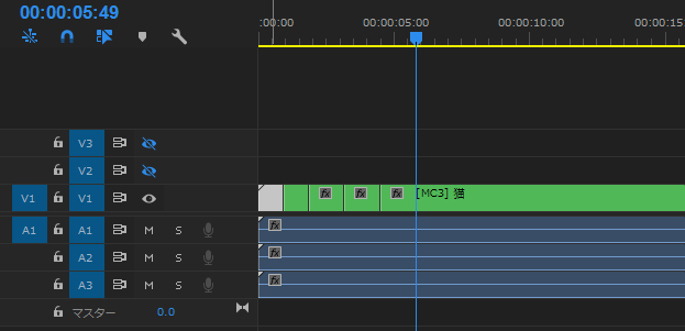 再生を止めると、タイムラインがカットされて、さきほどの切り替えたとおりにマルチカメラの切り替えが設定されています。
