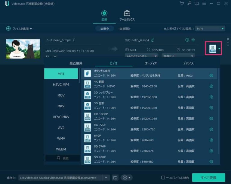 VideoSolo 「究極動画変換」はさまざまな形式に変換できるのが特徴です!