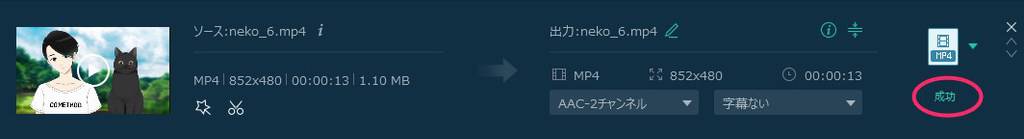 エンコードの処理をまって、項目に「成功」という文字が表示されれば動画変換完了です。