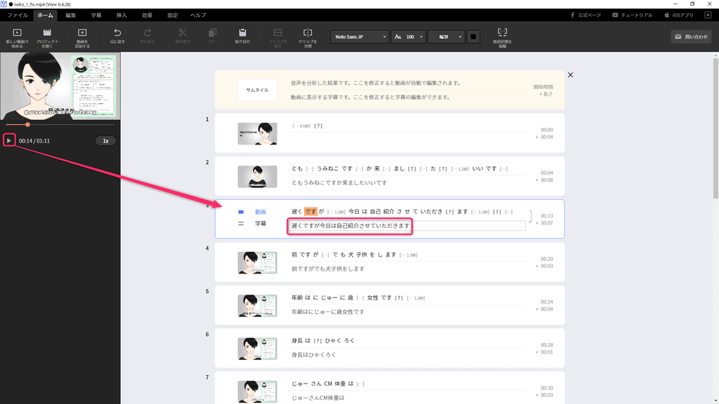 あとは動画を再生しながら、テロップを修正していきましょう。