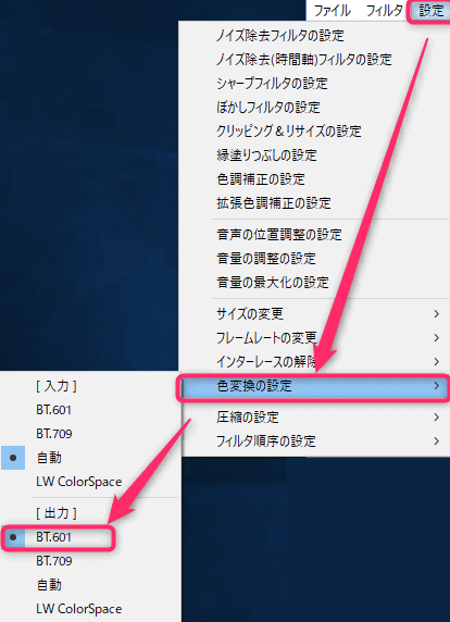 AviUtlで動画を開いたら、設定>色変換の設定>[出力]をBT.601にします。