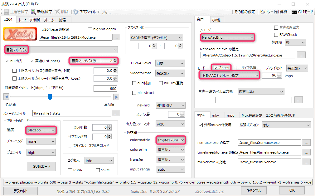 - 色空間 colormatrixは「smptel170m」にこちらもH264出力で色が変わってしまわないようにする設定になります。