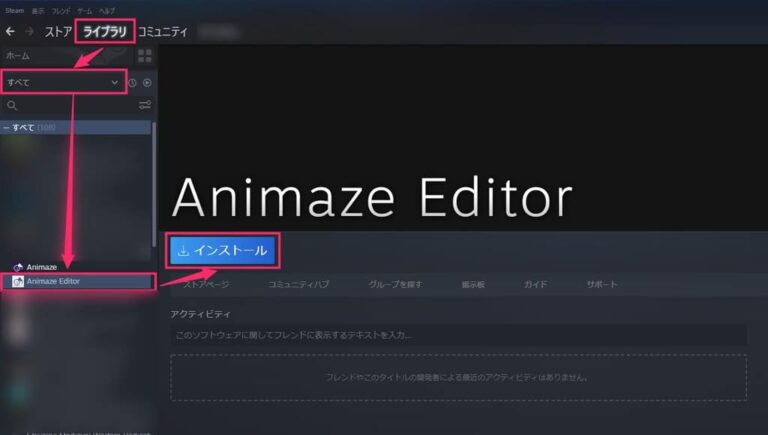 Steam>ライブラリ>すべて>Animaze Editorを選択してインストール