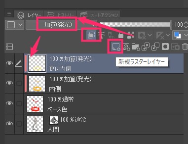 レイヤーを追加して、レイヤータイプを加算(発光)レイヤーにします。