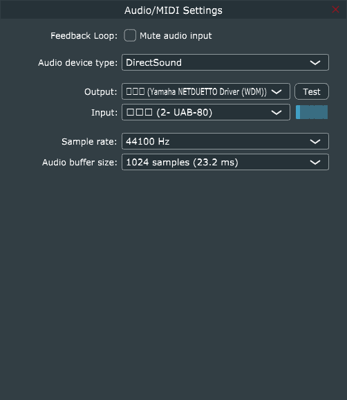 今回はAudio Buffer seizeを1024 samples(23.2ms)にしました。