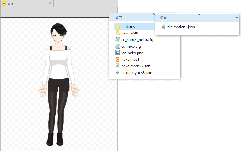 アニメーションをつけたら、ファイル>組込み用ファイル書き出し>モーションファイル書き出しから「idle.motion3.json」というデータをエクスポート