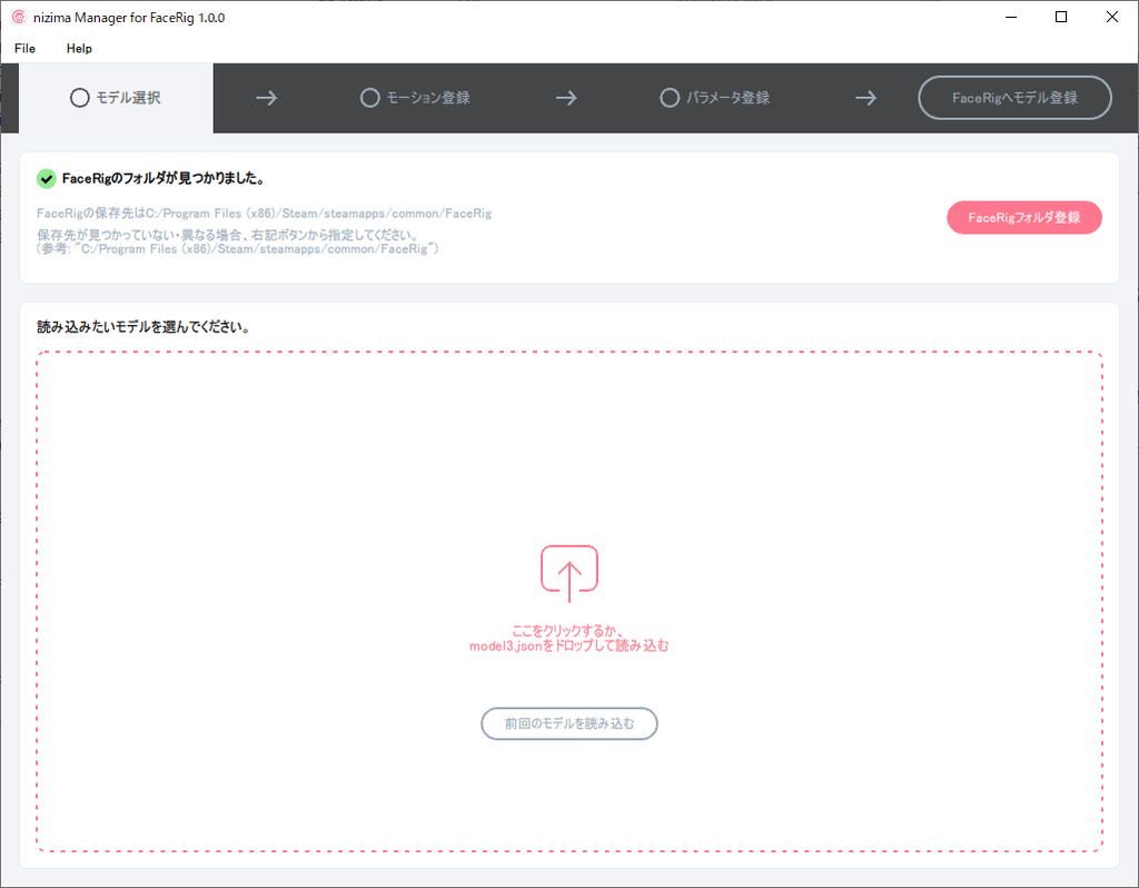 「FaceRigフォルダの登録」ボタンを押して、FaceRigの書き出し先を登録しましょう!