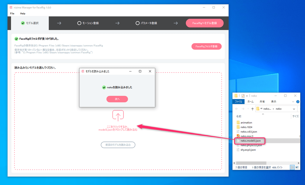 Live2Dで書き出した中の「〇〇.model3.json」というファイルを「にじマネ」にドラッグ&ドロップで登録します。