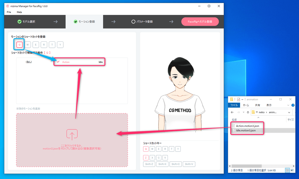 Live2Dで書き出した中の「〇〇.motion3.json」というモーションファイルを「にじマネ」にドラッグ&ドロップで登録します。