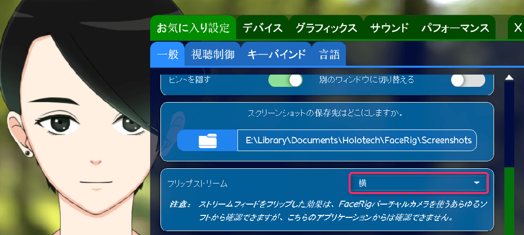 DiscordはFaceRigの表示が左右反転してしまうので、FaceRignoフリップストリームを横に設定しておきます。