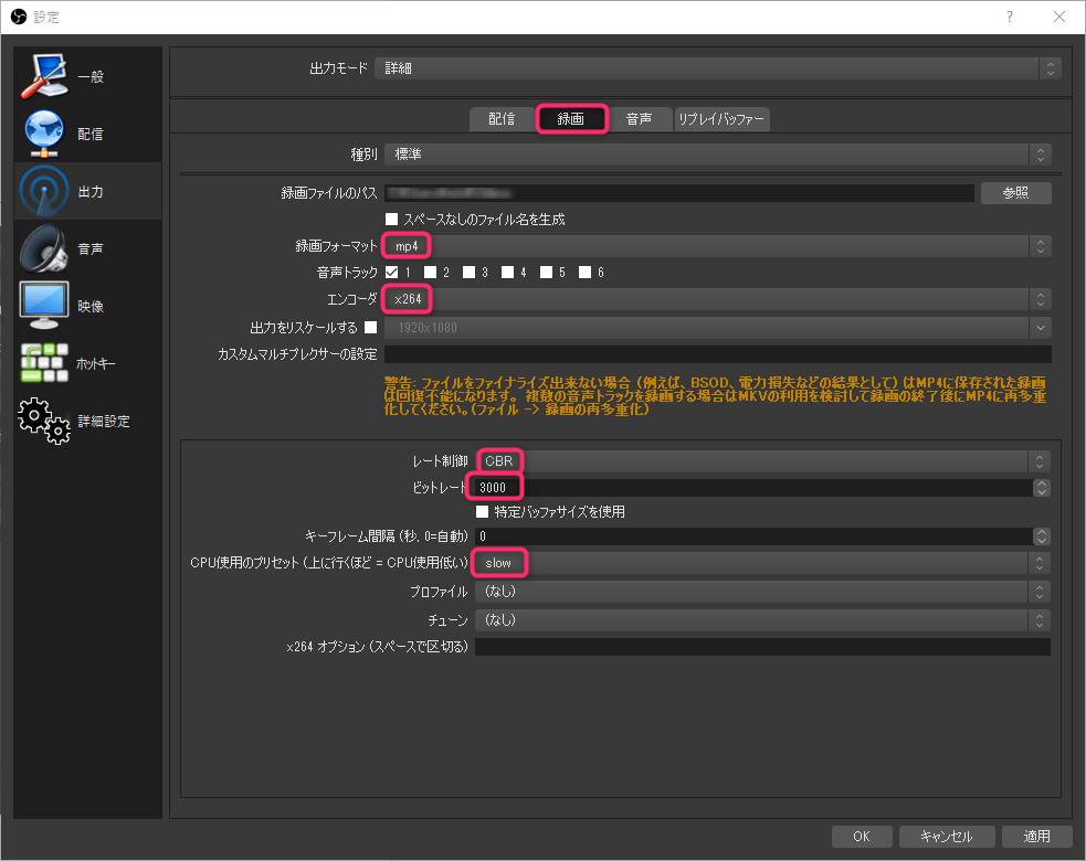 - 録画フォーマットをmp4に