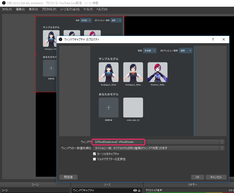 ウインドウのキャプチャを選択し、録画したいソフトを選択します。