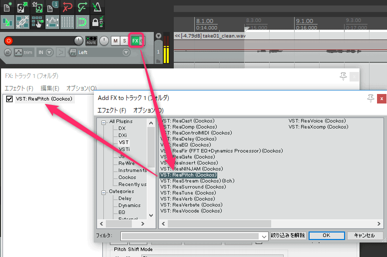 トラックの右上のFXボタンを押して、ウインドウが起動するので、VST>VST:ReaPitchを選択しましょう。