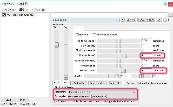 はじめはFormantを4に、Shift(Octaves)を1にしてから、調整すると良いでしょう。