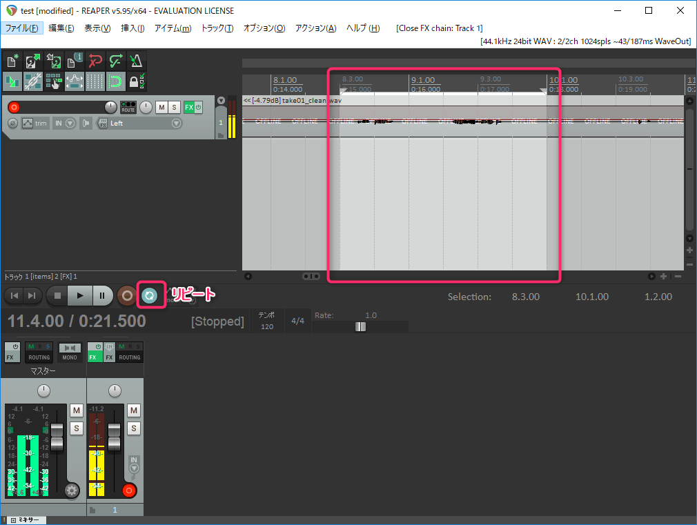 あとは、範囲選択とリピートボタンを点灯させて、再生し、声の変換具合を確認します。