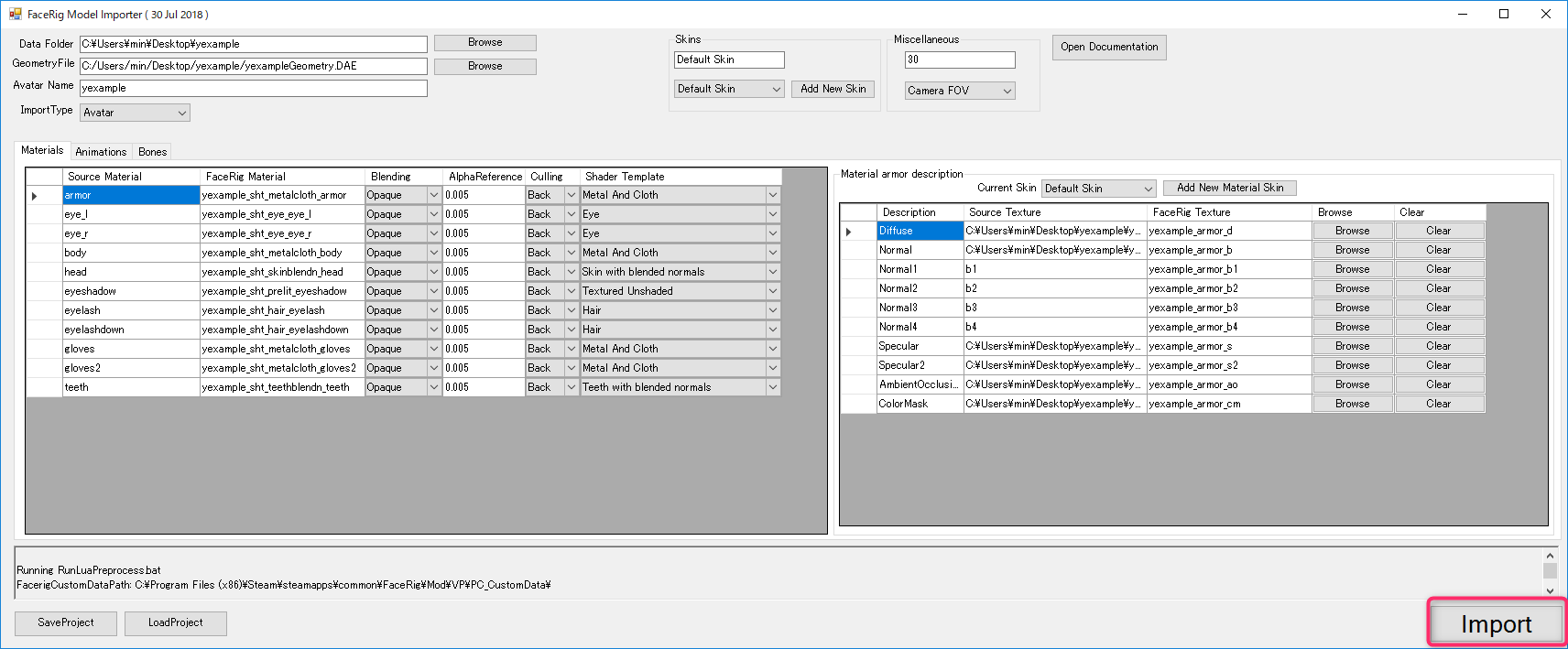 ウインドウ(FaceRig Model Importer)が表示されます、まずはそのままImportボタンをクリック。