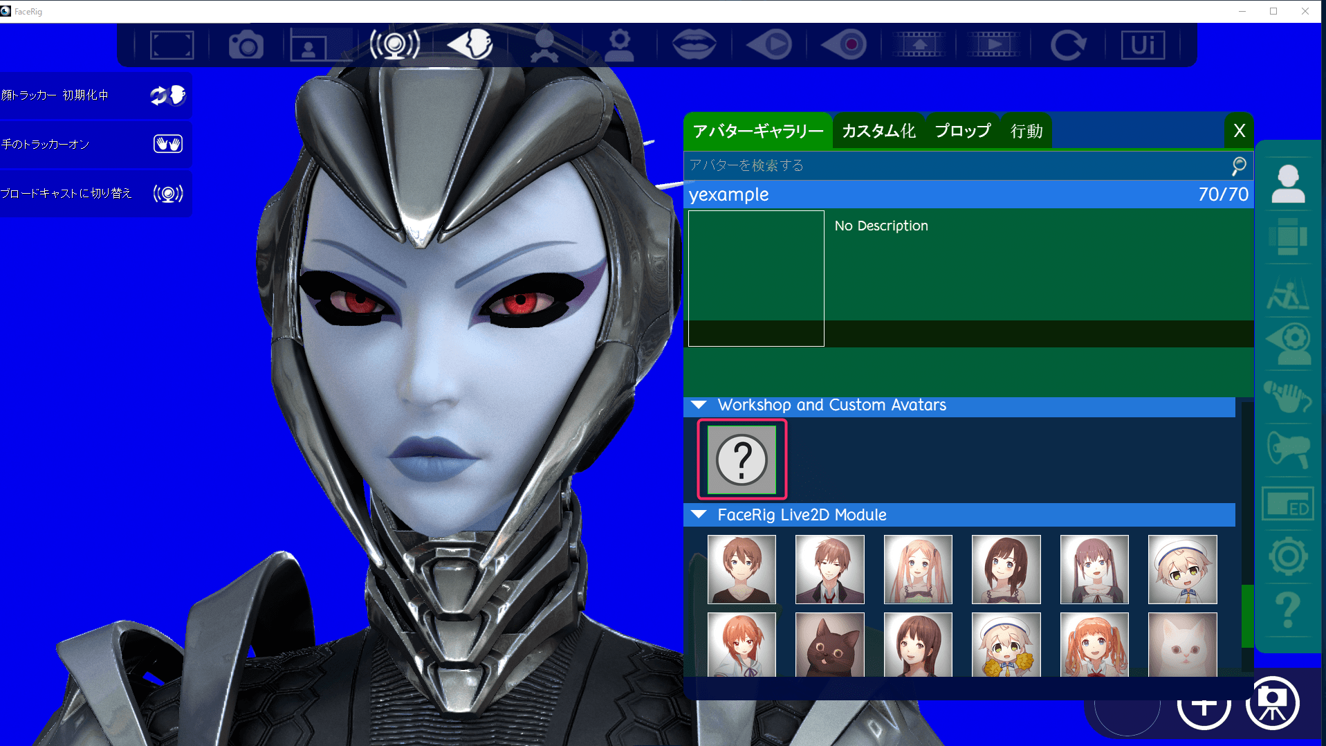 C:\Program Files (x86)\Steam\steamapps\common\FaceRig\Mod\VP\PC_Common\Objects\avatar\yexampleにデータが生成されていることを確認したら、FaceRigを起動。