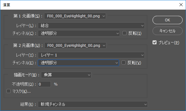 イメージ>演算でチャンネルを透明部分にしてあげると、機械的にアルファチャンネルが作成できます。