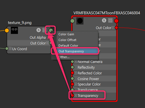 MayaにVRoidをインポートした時にテクスチャの透過が反映されないので、TransparencyをOut Transparencyに繋ぐと透過されるようになります