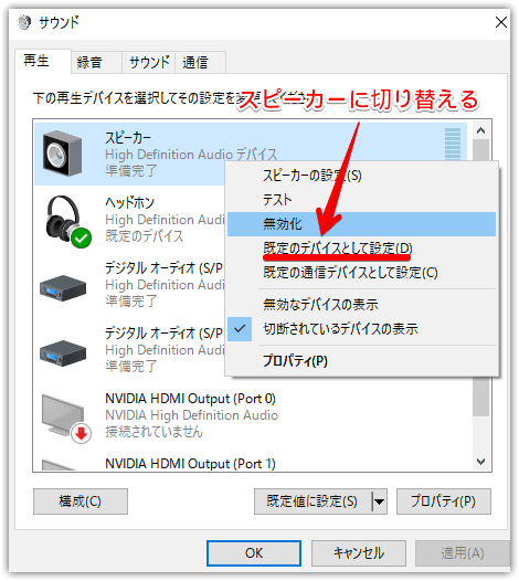 - サウンドの再生タブのスピーカーを右クリックして、規定のデバイスとして設置に