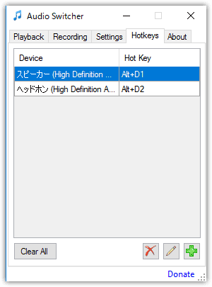 AudioSwitcherの起動して、下記の用にショートカットを設定します(スピーカーとヘッドホンそれぞれ登録)
