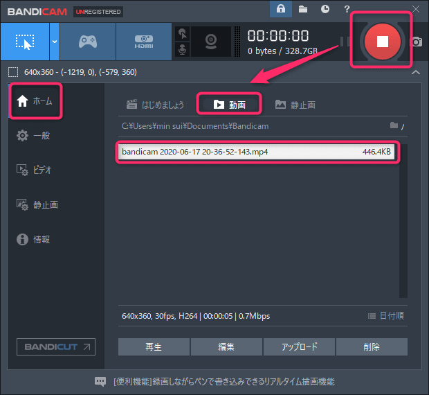 録画した動画はC:Users\ユーザー名\Documents\Bandicamに格納されます。