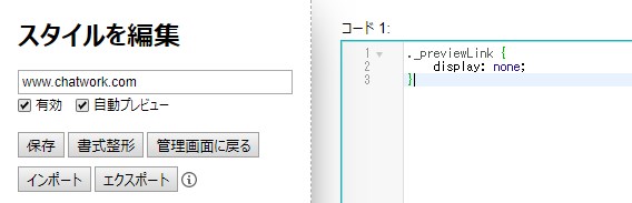 あとは下記のCSSをコピペして保存すれば、チャットワークでのプレビューの文字が非表示になります。