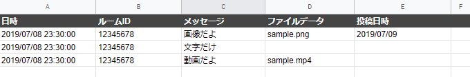 values[0] = [ '日時', 'ルームID', 'メッセージ','ファイルデータ', '投稿日時'];