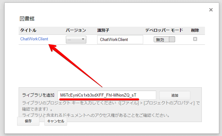 Google Apps Scriptを開いたら、まずリソース>ライブラリからChatworkClientのプロジェクトキーを検索して追加。バージョンを最新にして保存します。