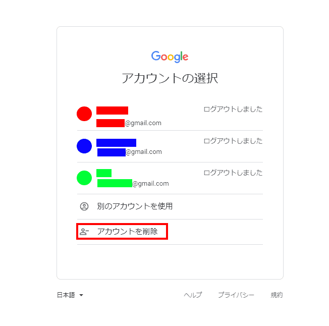2. ログアウト後のアカウント選択画面でアカウントを削除メニューが表示されますので消しましょう!