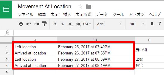 - Google Driveを見てみるとIFTTTというフォルダができていて、その中にMovement At Locationという名前にGoogle スプレッドシートが作成されて、記録されています。